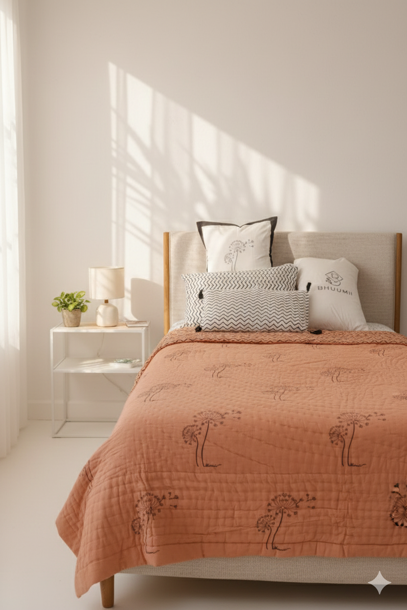 Made from 100% premium cotton, this quilt is lightweight, breathable, and incredibly soft — ideal for all seasons. Each piece is carefully handcrafted by skilled artisans, making every quilt unique in design and texture. The minimal dandelion prints bring a modern, artistic vibe while keeping the look refined and timeless.