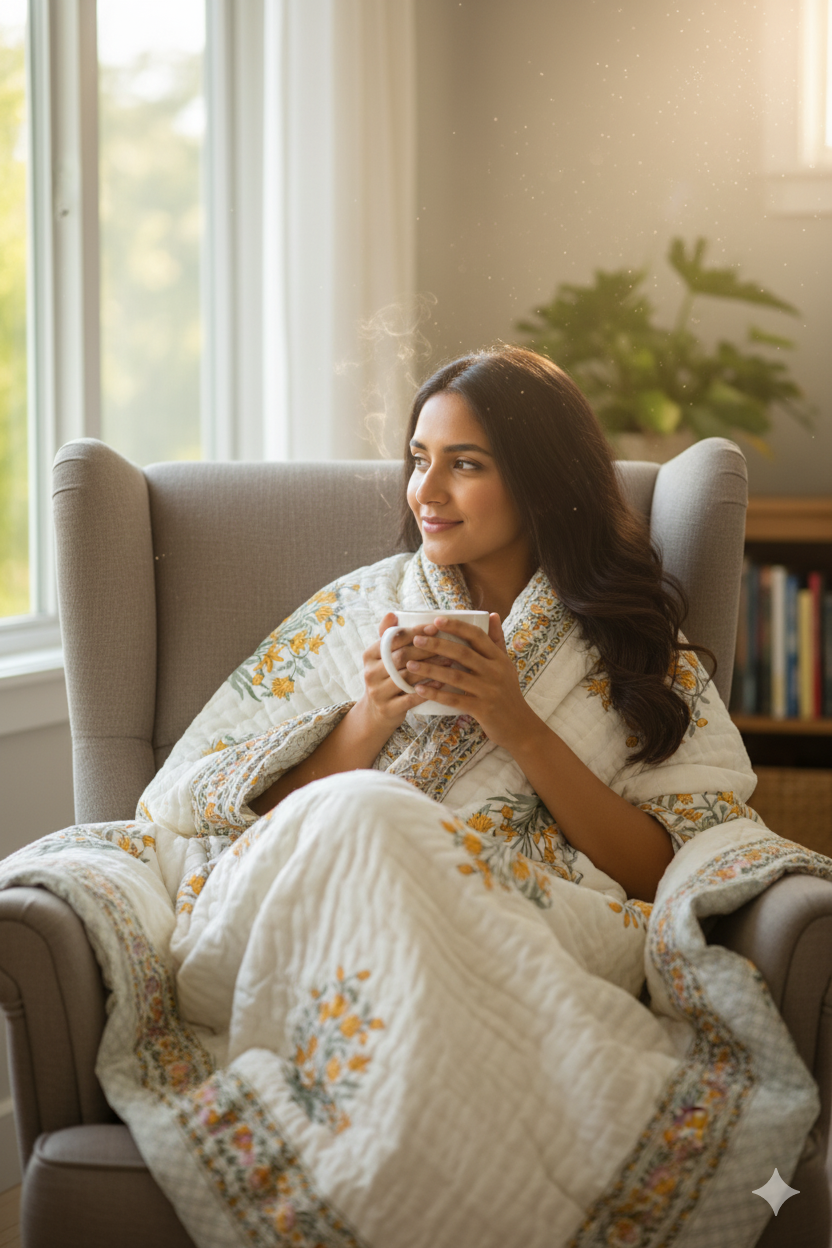 Made from 100% premium cotton, this lightweight quilt offers breathable comfort throughout the year — cozy in winter and cool in summer. Every piece is block printed using traditional wooden blocks, ensuring a unique handmade touch and exceptional quality.