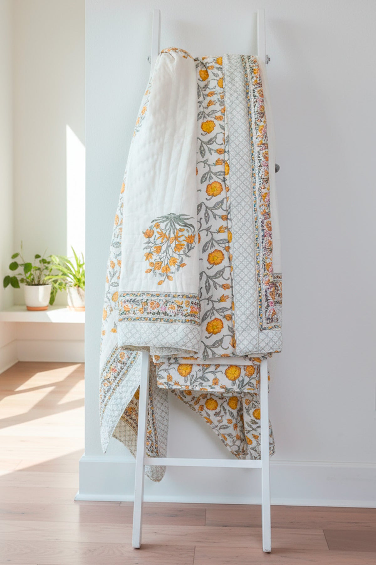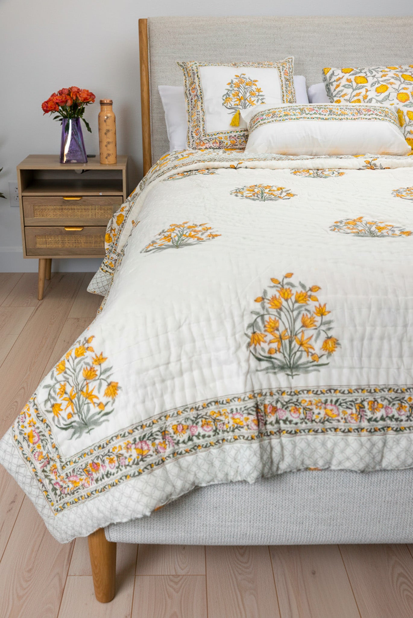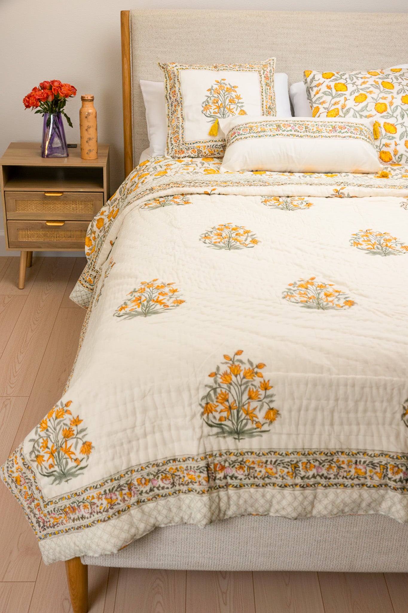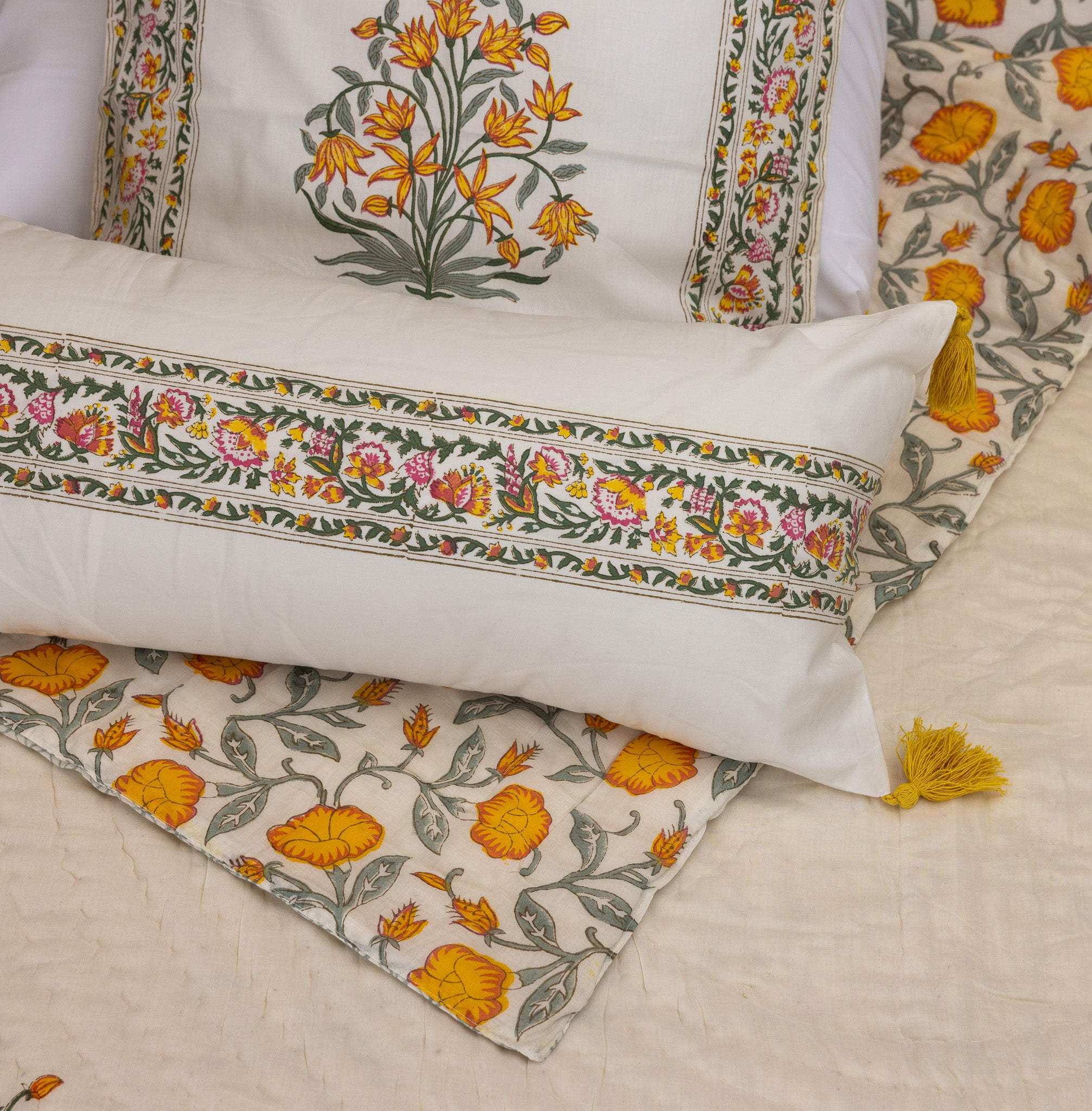 Yellow Floral Hand Block Printed Cotton Quilt Set