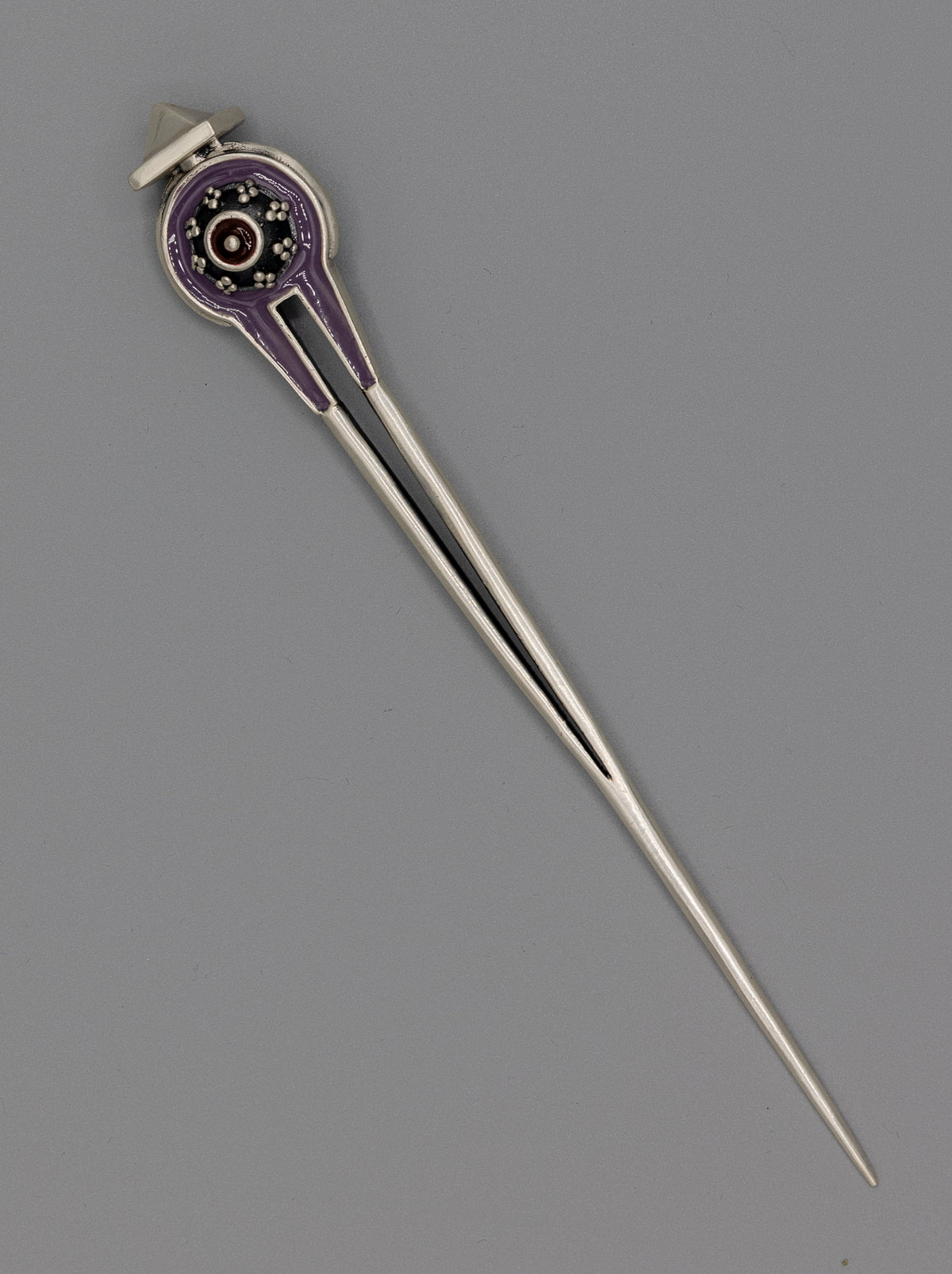 Base metal with E-coated silver oxidized plating and vibrant purple enamel accents.